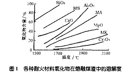 圖1為各種耐火材料氧化物在熔融煤渣中的溶解度。由圖1可知,Cr203在煤氣化爐渣(SiO2一CaO 系)及各種玻璃熔體中的溶解度比其他氧化物材料的溶解度要小得多。因而Cr203或含Cr203的耐火材料具有良好的抗鋼渣、有色冶煉渣、煤氣化爐渣、 油氣化爐渣和各種玻璃熔體熔蝕能力。Cr203熔體或Cr203,與爐渣反應(yīng)生成的液相粘度比其他低熔物粘度大,這就阻止了熔渣沿毛細(xì)氣孔向磚體內(nèi)部滲透,避免形成變質(zhì)層而產(chǎn)生結(jié)構(gòu)剝落。