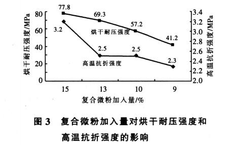 本澆注料屬于低水泥系列,難點在于既要在1500℃保溫0.5h 后獲得較高的高溫抗折強度值,又要具有較高的烘干耐壓強度。因為烘干耐壓強度主要來源于水泥的水化,為了得到較高的烘干耐壓強度,勢必要加入較多的水泥,而較多的水泥又會使高溫下的液相量增加,使高溫抗折強度下降, 前期的試驗工作已經證實了這一點。為了解決這個矛盾,必須在優化基質上下功夫,也就是 uf-SiO2 和 α-Al2O3 復合微粉的加入量要進行嚴格的控制,既要發揮uf-SiO2的結合作用來增加強度,又要控制高溫下的液相量使高溫抗折強度達標。 本試驗將水泥的加入量定為2%,考察復合微粉的加入量對常溫耐壓強度和高溫抗折強度的影響, 試驗結果示于圖3