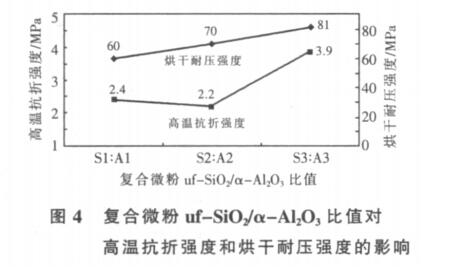 由圖3可知,當復合微粉的加入量為15%時,烘干耐壓強度和高溫抗折強度值最高。固定復合微粉的加入量為 15%, 改變復合微粉中uf-SiO2 和 α-Al2O3 的比例,圖4示出uf-SiO2/α-Al2O3 不同比值的高溫抗折強度和烘干耐壓強度。
