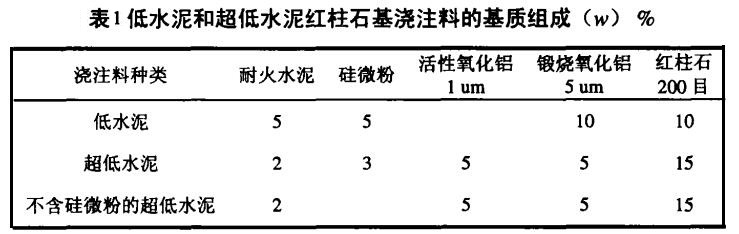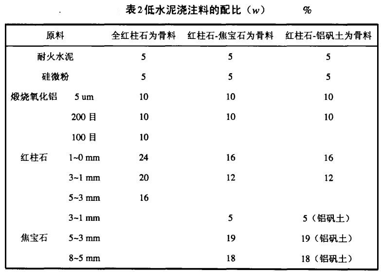 表2示出了不同低水泥骨料澆注料的配比:(1)以全紅柱石為骨料的低水泥澆注料,可用于 對熱穩定性,抗熱震性和低蠕變性要求很高的設備中。如中間包,鋼水包和鐵水包的永久襯等。(2)紅柱石骨料的50%換成焦寶石。焦寶石是莫來石和方石英的混合物,它的各項性能均低于紅柱石。與全紅柱石澆注料相比,這種澆注料的性能稍有下降,但成本減少很多。(3)把全紅柱石澆注料骨料中的中大顆粒換成鋁礬土。鋁礬土的基本組成是燒結剛玉有很強的抗機械磨損性能。這種澆注料除紅柱石帶來的熱穩定性,抗熱震性和低蠕變性外,鋁礬土的加入帶來了抗機械磨損性能。可用于鋼水包,鐵水包和高爐的鐵水溝工作襯。