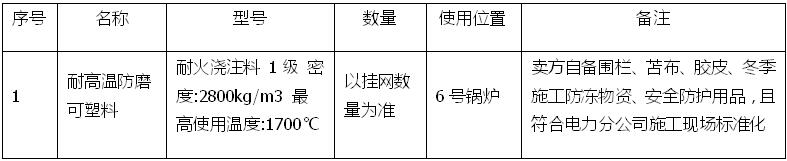 ③ 耐高溫防磨可塑料所用攪拌工器具、架桿、焊機等由賣方自行安排,所有電氣工具經驗收合格方可使用,如良好的接地等。
