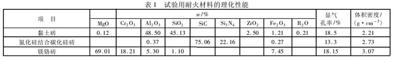 煙塵的主要化學(xué)組成為:SiO2 10.52%,CaO 37.27%,Fe2O3 29.64%,MgO 4.34%,AL2O3 2.21%,MnO 2.56%,TiO20.85%,K2O 0.02%,Cr2O3 1.13%,ZnO 7.05%。可見該煙塵為堿性渣。使用的三種耐火磚的主要理化指標(biāo)見下表