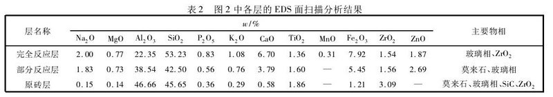 抗渣試驗后粘土磚試樣的SEM照片見圖2,由圖2a可以看出,侵蝕后試樣可分為完全反應(yīng)層、部分反應(yīng)層和原磚層三成。根據(jù)各層的放大照片圖2(b)、圖2(c)和圖2(d)一級各層的EDS面掃描分析結(jié)果(見表2),經(jīng)分析認(rèn)為:高溫下液態(tài)煙塵渣與粘土磚接觸后發(fā)生滲透、侵蝕反應(yīng),粘土磚中的主要成分SiO2、AL2O3容易溶解到煙塵渣中。因此粘土磚抗煙塵渣侵蝕性較差。