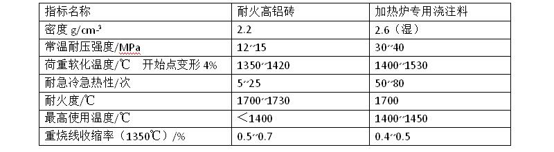 (1)加熱爐專用澆注料有良好的高溫使用性能,加熱爐專用澆注料大幅度提高爐子壽命的原因是這種澆注料的基質(zhì)石英型AIPO4(熔點(diǎn)約2000℃)呈鏈狀空間網(wǎng)狀高分子結(jié)構(gòu),所以它除了有良好的耐火性之外,高溫下還具有韌性、抗沖擊性和耐磨性一級(jí)熱穩(wěn)定性。當(dāng)爐溫超過1400℃后,由于燒結(jié)等物理化學(xué)反應(yīng),強(qiáng)度又提高了。因而加熱爐專用澆注料在1400℃以上的高溫時(shí),性能優(yōu)于耐火磚砌筑。兩種耐火材料的主要性能列于表1
