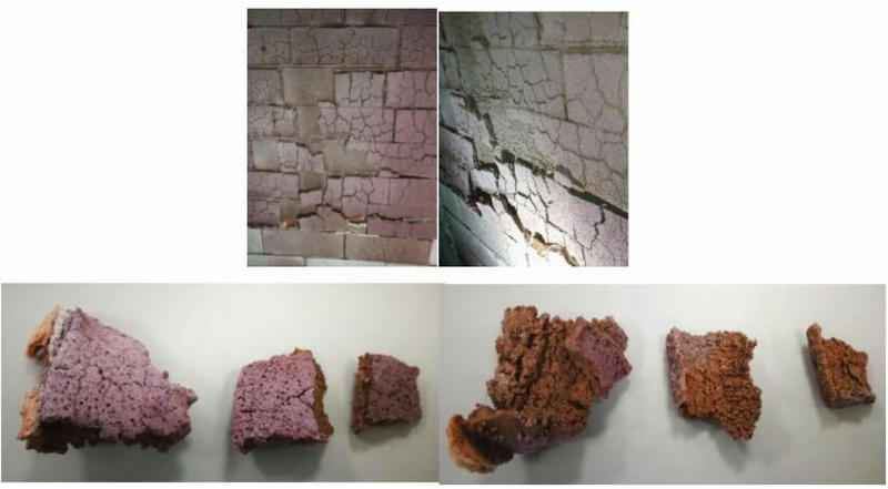 在裂解爐正常運行期間,燒焦流程的管道處于冷態,如切換裂解氣大閥的防焦蒸汽有可能滲入到燒焦管道內,在燒焦管道內會產生冷凝水(實際操作中證明了這點:在爐正常運行期間,打開燒焦管道底部的導淋閥,常有水排出)。當從正常生產工況切換至燒焦工況的瞬間,高溫的燒焦氣與稀釋蒸汽一并進入燒焦管道(無輔助的預熱管道)這部分冷凝水未完全汽化便隨燒焦氣進入高溫的爐膛,直接噴灑到高溫的耐火磚表面,導致耐火磚淬火開裂,稀釋蒸汽中夾帶的NaOH也滲入了裂縫中,在后續的高溫下分解成Na2O。和水蒸氣,在耐火磚熱面形成富鈉區域,產生化學反應生成鋁酸鹽等堿性化合物,從而降低裂縫周邊耐火磚的熔點溫度,在高溫下熔化剝離。