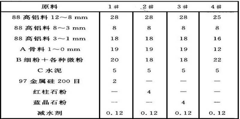 隨著熱工窯爐生產溫度的不斷提高,最高溫度區達1450℃以上,對耐火材料的高溫蠕變性能、熱震穩定性能、荷重軟化溫度均提出了更高的要求。根據鍛造工廠使用熱工窯爐的破壞調查,對內襯使用的耐火澆注料也越來越重視其高溫蠕變性能,即高溫條件下耐火澆注料不收縮不開裂的能力,按照溫度條件對耐火澆注料性能的要求對產品進行配方調整: