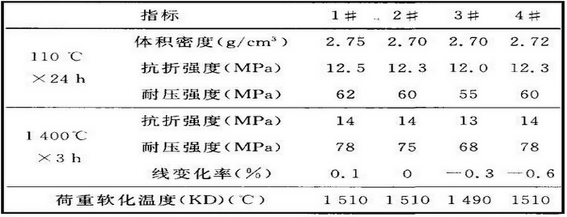 按照比例配好料經加水混合均勻后,倒入模具中振動成形為40mmX40mmX160mm試樣各6組,在室溫下養護24h后脫模,測試110X24h 處理后體積密度、抗折強度、耐壓強度和1400X3h處理后抗折強度、耐壓強度、荷重軟化溫度、燒后線變化率。實驗結果見表2