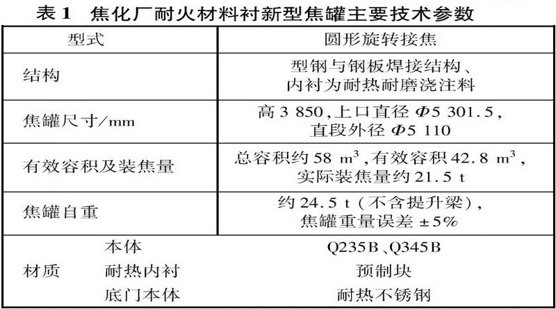 耐火材料襯新型焦罐是在不改變?cè)瓊鹘y(tǒng)合金襯板焦罐外形尺寸的前提下,采用耐火材料替代原合金襯板,用整圈鋼板替代原有框架結(jié)構(gòu)的技術(shù)。它的特點(diǎn)是根據(jù)罐體不同部位的工況采用不同材質(zhì)的耐火材料內(nèi)襯和不同的施工工藝。新型焦罐主要技術(shù)參數(shù)見(jiàn)表1