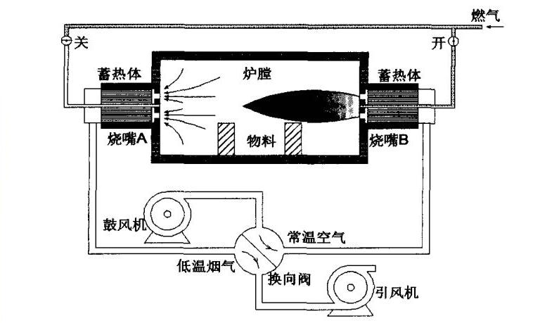 蜂窩體陶瓷作為蓄熱體,使傳統(tǒng)的蓄熱室發(fā)生了巨大的變化。從原來的格子磚發(fā)展成為陶瓷小球,又發(fā)展為蜂窩體蓄熱,蓄熱室的比表面積急劇增大,體積明顯減小,換向時間大大縮短,換熱性能得到極大提高,整個蓄熱的過程如下圖。