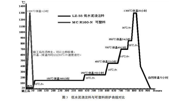 可塑料適合一年四季施工,在施工后無須養(yǎng)護,以立即升溫,烘爐升溫速度為50 ℃/h,一般24 h 即可達到生產(chǎn)操作所要求的爐溫,大大縮短了烘爐時間,減少了烘爐費用。而澆注料在施工后需要等待固化、養(yǎng)生、漫長的烘爐過程,且不適合在冬季施工,必須注意防凍。澆注料和可塑料的烘爐曲線對比見圖。