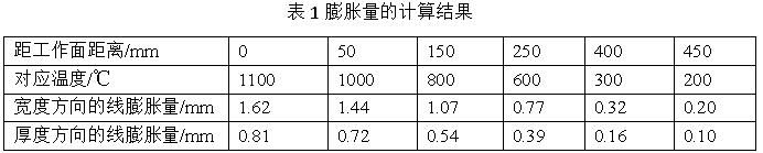 能夠導致“襯殼分離現象”的磚體膨脹作用主要發生在磚的寬度和厚度方向上,因此,我們主要來計算每塊磚在250mm長度的不同溫度段、寬度和厚度方向的線膨脹量,計算公式為:寬度方向的線膨脹量= 105×熱膨脹率/100 ,厚度方向的線膨脹量= 75 ×熱膨脹率/ 100 ,其中的熱膨脹率參照表1,計算的結果見。