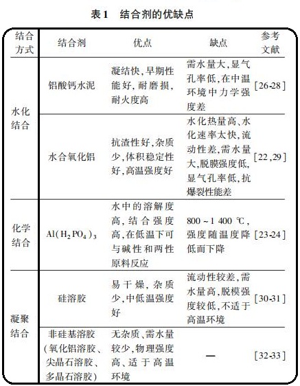 各種結合劑的優缺點如上(表1)所示,鋁酸鹽鈣水泥凝結時間短,脫膜強度高,在高溫環境中具有良好的力學強度,但其卻不適于中溫環境,而磷酸鹽和硅溶膠則適用于中低溫的工作環境。水合氧化鋁、硅溶膠和非硅基溶膠均具有雜質少的優點,有利于提高澆注料的純度,從而增強其物理性能。 此外,鋁酸鈣水泥、水和氧化鋁和硅溶膠均需水量較大, 導致澆注料的顯氣孔率低, 抗爆裂性能差。