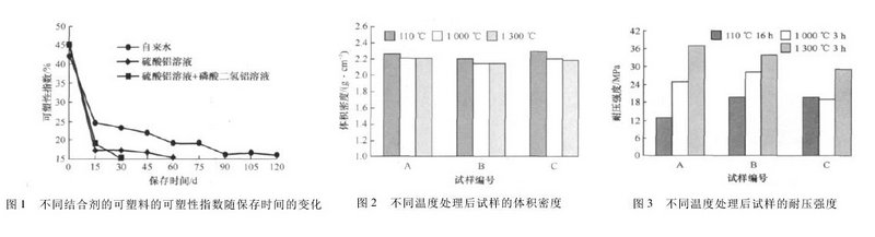 試驗(yàn)采用三種結(jié)合劑分為A/B/C三組,分別以自來水、硫酸鋁溶液、硫酸鋁溶液+磷酸二氫鋁溶液為結(jié)合劑。將骨料劑粉料加入到輪碾中,混合均勻后加入結(jié)合劑,待達(dá)到要求的可塑性指數(shù)(要求的可塑性指數(shù)哦為40%~45%)后取出,密封保存24h然后搗打成標(biāo)準(zhǔn)試樣進(jìn)行測試。