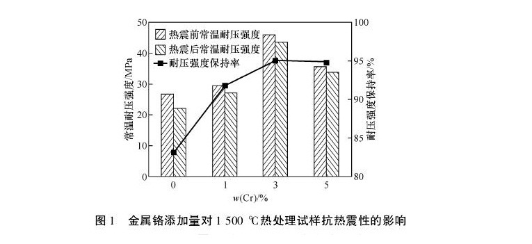 圖1示出了金屬鉻添加量對(duì)1500℃熱處理試樣抗熱震性能的影響。由圖1可知,未添加金屬鉻時(shí),試樣CO強(qiáng)度保持率為83.2%。隨著金屬鉻添加量的增加,試樣的強(qiáng)度保持率增加。當(dāng)金屬鉻添加量為3%時(shí),試樣的強(qiáng)度保持率最大達(dá)到95.1%。進(jìn)一步增加金屬鉻添加量,當(dāng)金屬鉻量為5%時(shí),強(qiáng)度開始下降。