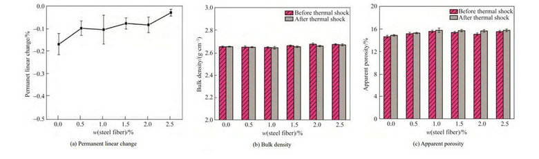 圖1為1200 ℃熱處理后不同鋼纖維加入量對(duì)莫來石質(zhì)澆注料常規(guī)物理性能的影響。由圖1可見,隨著鋼纖維加入量的增加,澆注料線收縮率逐漸變小(見圖 1a)。這是因?yàn)殇摾w維的熱膨脹系數(shù)較大約為(12~14)×10–6 /℃,遠(yuǎn)高于莫來石澆注料基體約為(4~6)×10–6 /℃,造成添加鋼纖維后的線變化率趨向于膨脹。同時(shí),隨著鋼纖維加入量的增加,成型時(shí)所需加水量增加,雖然鋼纖維密度大于莫來石基體材料,但因鋼纖維加入量不大(最大量為2.5%),導(dǎo)致澆注料的體積密度隨鋼纖維添加變化較小,即體積密度在2.65~2.68 g/cm3,顯氣孔率在14.6%~15.5%波動(dòng)變化。熱震后因材料內(nèi)部裂紋的出現(xiàn),結(jié)構(gòu)變得疏松,表現(xiàn)為澆注料的 體積密度下降(見圖 1b),顯氣孔率增加(見圖 1c)