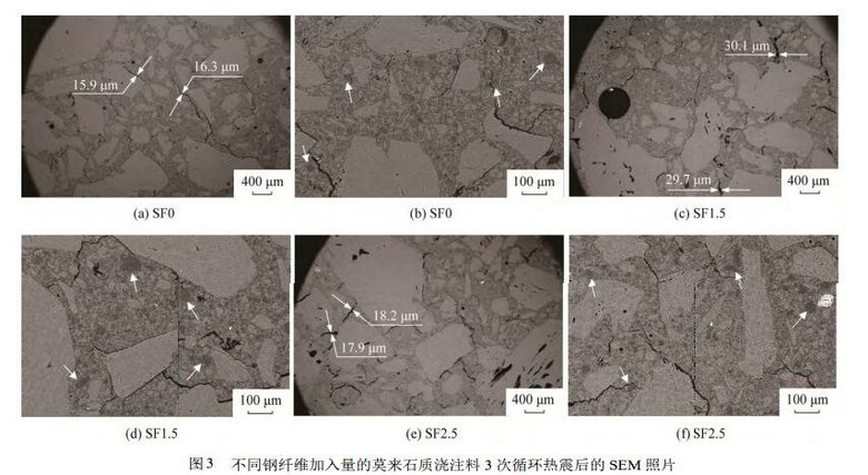 在熱震過程中,隨著鋼纖維的增加,澆注料內(nèi)部缺陷的數(shù)量會(huì)增多,也將導(dǎo)致材料彈性模量保持率的降低(見圖2b);缺陷數(shù)量增多提高了彼此間橋接互聯(lián)的概率,增加了澆注料基體結(jié)構(gòu)的不連貫性,引起材料超聲波波速保持率的下降(見圖 2c)。