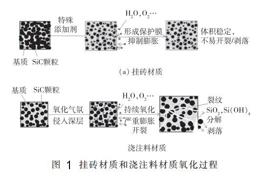 圖1表示了掛磚材質(zhì)和澆注料材質(zhì)在氧化侵蝕過程中的變化特征,由于澆注料材料致密度方面要低于掛磚,且碳化硅氧化過程中體積膨脹明顯,最終導(dǎo)致澆注料開裂,加速材料退化。對 于掛磚,廠內(nèi)制磚過程中加入抗氧化的添加劑,同時調(diào)控?zé)u氣氛,因此,掛磚材質(zhì)體積穩(wěn)定,不 易開裂/剝落,從而抗氧化能力遠高于澆注料,同時,致密度越高的材料抗氧化程度越強。