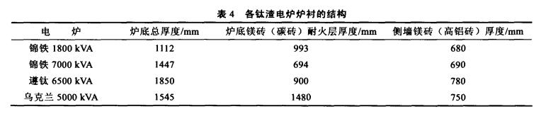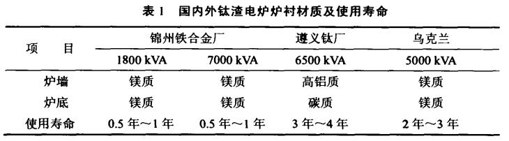 目前,鎂質(zhì)耐火磚、高鋁質(zhì)耐火磚和碳質(zhì)耐火磚在鈦渣電爐上都有應(yīng)用,鈦渣電爐爐體的大修周期最長的為3年~4年,短的只有半年,國內(nèi)外鈦渣電爐主要材質(zhì)及使用壽命見表。