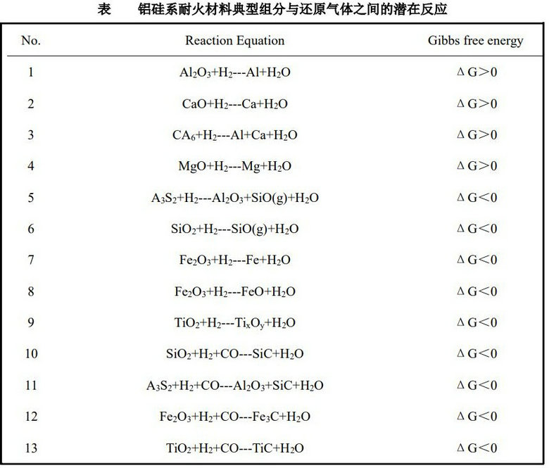 鋁硅系耐火材料主要成分在純氫以及 H2/CO 混合氣氛下的熱力學平衡,經過計算和分析可以得到以下結論: