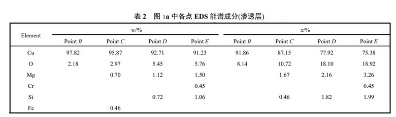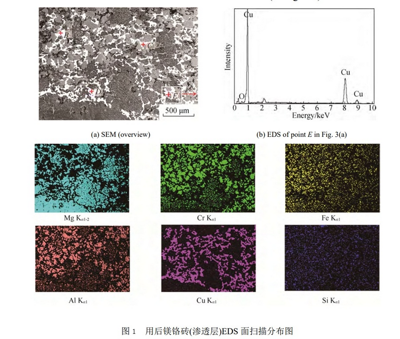 圖1為鎂鉻磚(滲透層)各元素的面分布與 Cu2O 的能譜特征峰。由圖1可見,Cu–CuxO 等金屬熔體滲透形貌清晰可辨,電熔鎂鉻砂、鎂砂與基質鉻鐵礦尖晶石結合界面的滲透(亮白色區域)主要由 Cu、O 元素組成。表2為圖 1a 中各點 EDS 能譜成分(滲透層)。由表2可知,方鎂石晶粒與基質鉻鐵尖晶石結合界面以金屬熔體氧化亞銅 (Cu2O)滲透為主。
