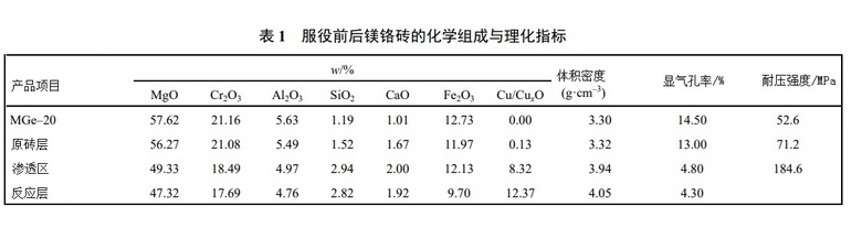 對NGL爐現場用后鎂鉻磚的觀察,Cu–CuxO 等熔體對耐火材料的侵蝕以滲透為主,這種熔體深入滲透到鎂鉻磚結構,可達260 mm 以上。耐火材料的體積密度和氣孔率隨著熔體的滲透而發生變化,表 1(理化指標)顯示殘磚滲透層的氣孔率較類原磚層有大幅下降,體積密度相應的增加,反映了材料內部結構和性質的顯著變化。