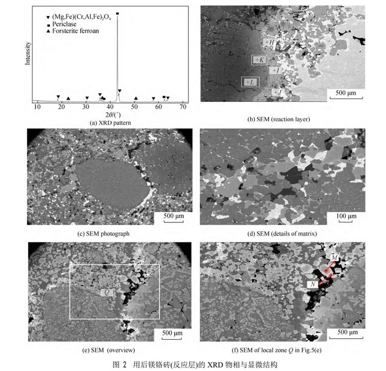 NGL 火法精煉工序的廢雜銅一般雜質含量在 4%~20%,廢雜銅雜質含量明顯高于銅精礦熔融粗銅的雜質量(0.5%~2.0%),廢雜銅中含有 Pb、Zn、As、Sb、Bi、Ni、Fe 等金屬元素,NGL 爐精煉廢雜銅所含雜質過多需反復氧化和造渣,致使爐襯耐火材料易被侵蝕。圖2為用后鎂鉻磚(反應層)的XRD物相與顯微結構。由圖2可知,鎂鉻磚熱面(反應層)受 NGL爐渣與金屬銅熔體的雙重作用,熔渣與MgO顆粒反應生成鎂橄欖石(含鐵)和(Mg,Fe,Ni)O 固溶體,與鉻鐵尖晶石形成(Mg,Fe, Ni)(Cr,Al,Fe)2O4 的復相尖晶石。殘磚反應層XRD物相為方鎂石和鉻鐵礦尖晶石,少量橄欖石(含鐵)物相。鎂砂顆粒易受熔渣的侵蝕,部分方鎂石晶粒被溶渣侵蝕,在基質或顆粒與基質結合處溶解成孔及裂痕。鉻鐵礦顆粒沒有被深入侵蝕現象,在 1 700 ℃條件下,FeO 和 Cr2O3 在 MgO 的固溶度為 14%,反映了鎂鉻質耐火材料具有良好的抗渣滲透能力。